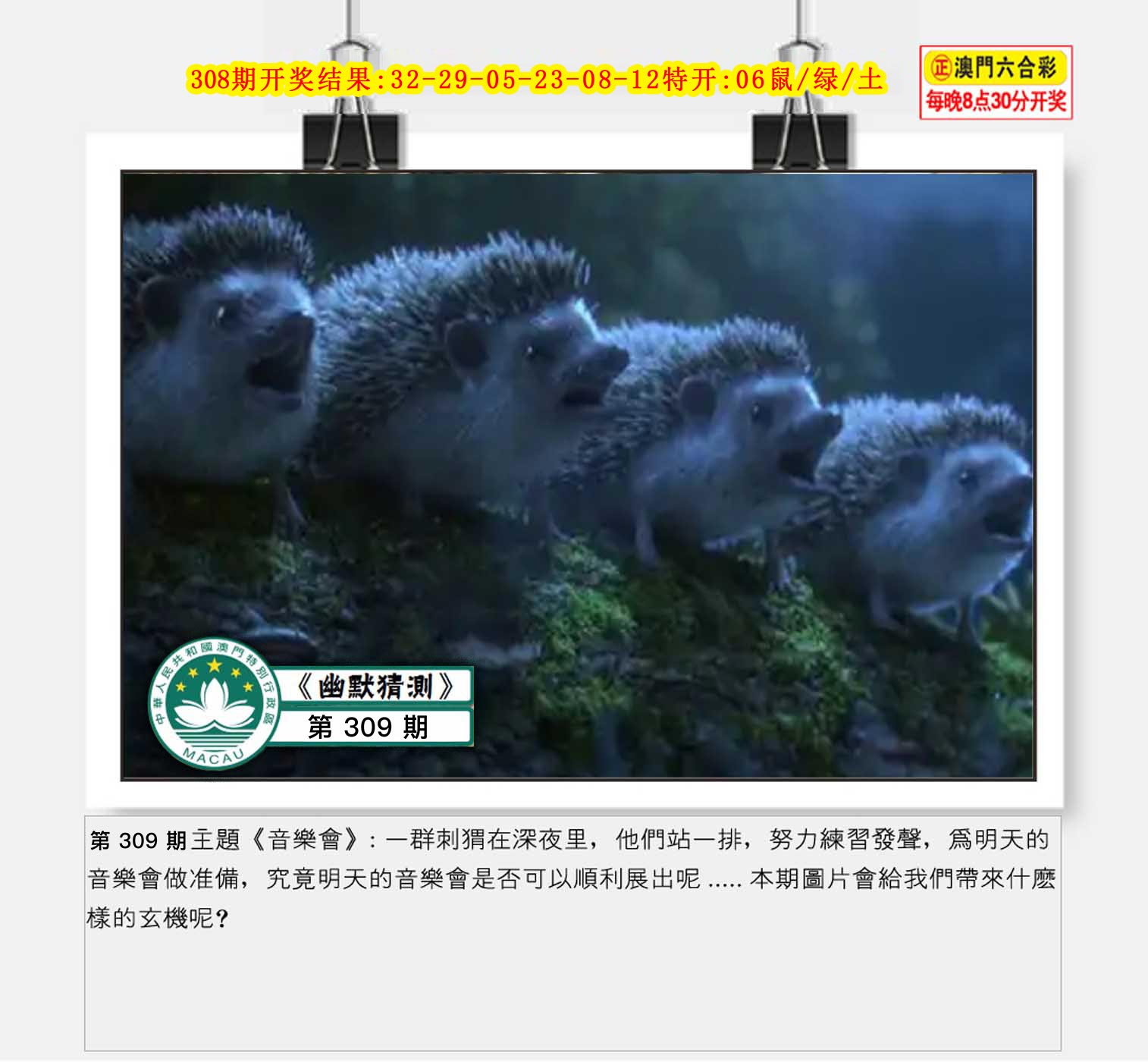 一群刺猬在深夜里,他們站一排,努力練習發聲,篇明天的音樂會做准備,究竟明天的音樂會是否可以順利展出呢.....本期圖片會給我們帶來什麼樣的玄機呢?